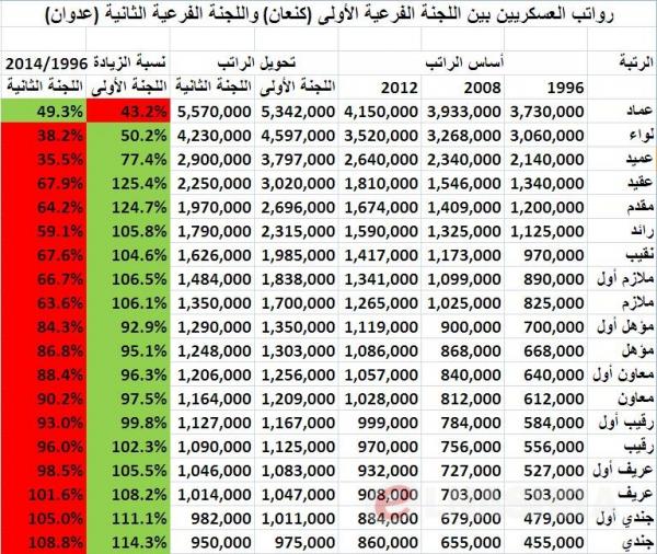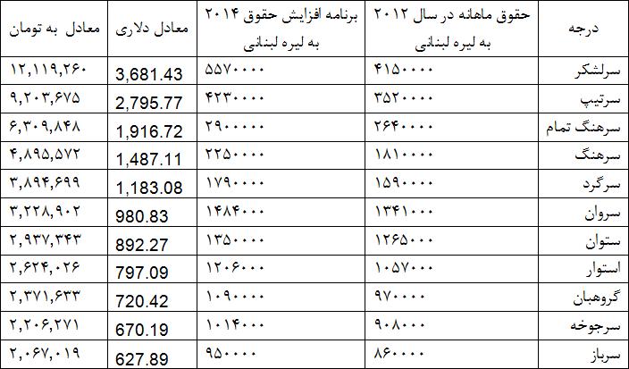 مدتها است گروه های کارگری و اتحادیه ها و اصناف در لبنان برای تصویب افزایش حقوق، دست به تظاهرات و تعطیلی و اعتصاب می زنند. جدول زیر حقوق ارتشی های لبنان را نشان می دهد و برنامه پیشنهادی برای افزایش آن. با این حال معتقدند در حق ارتشیها ظلم شده و نسبت افزایش حقوق کافی نیست. همانطور که در جدول اصلی می بینید دو طرح برای افزایش حقوق وجود دارد. یکی طرح اول که کارگروه اول به ریاست آقای کنعان آنرا محاسبه کرده، و یکی کارگروه دوم به ریاست آقای عدوان.